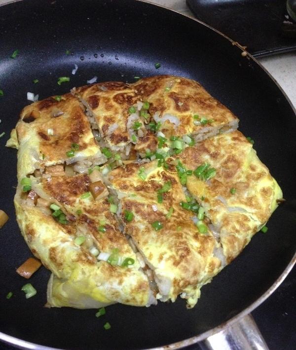 成败在此一举➰翻面时一定要小心,最好两个锅铲同时配合,以免馅露出来了。 装盘,用刀切成四小块,撒上葱花