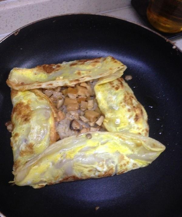 一定要用不沾的平底锅,锅里放少许油,将面糊倒入锅中,迅速转动锅,不要太厚。(小火)