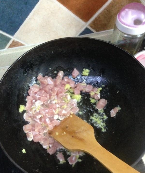 先放入姜末,炒香,再放入五花肉(因为我不吃肥肉,所以用梅子肉代替)炒至变色。