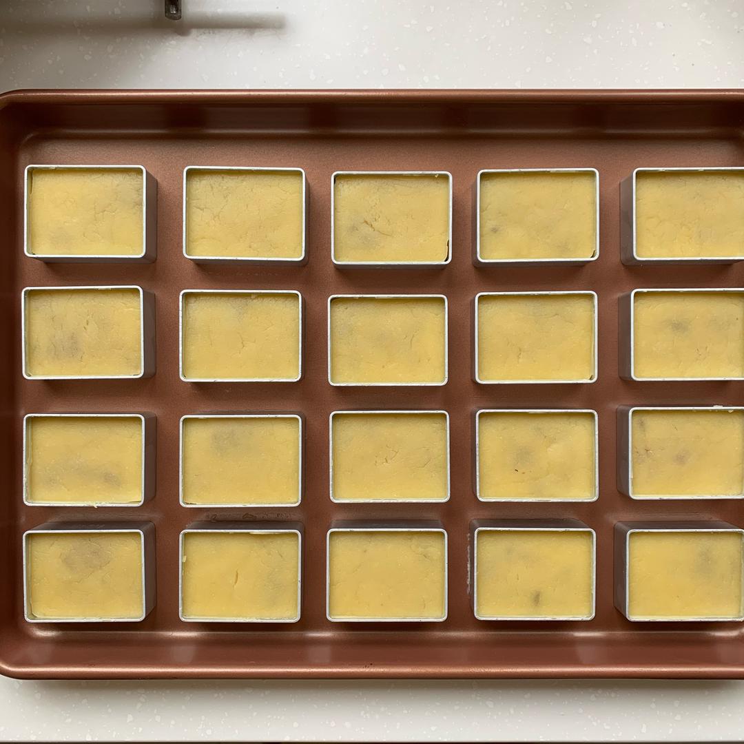 滚成圆柱形放入模具,略微压扁,用压模按平