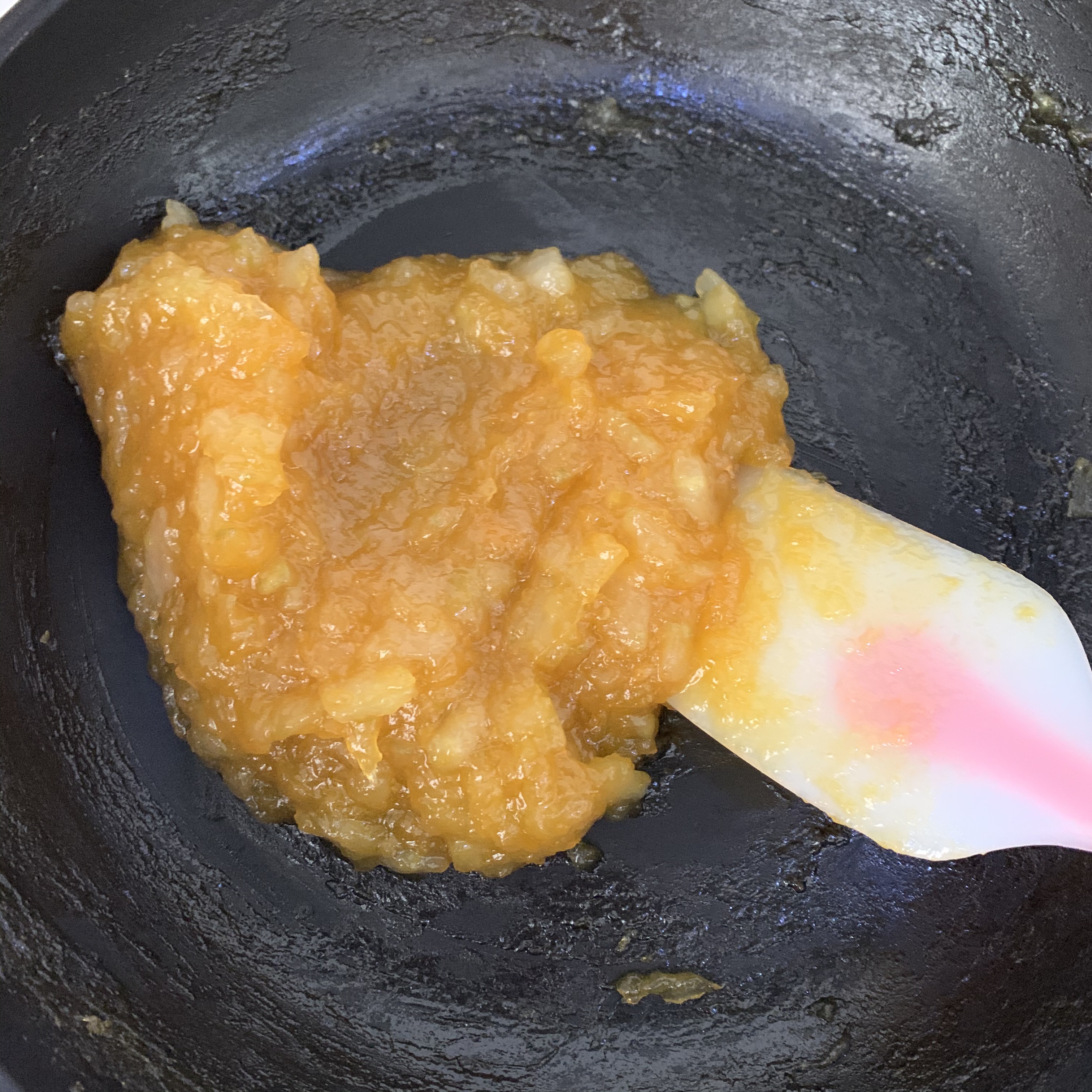 把冬瓜茸和果酱倒入平底锅,开中小火,全程不停搅拌,直到开始冒泡泡,加入糖和水饴