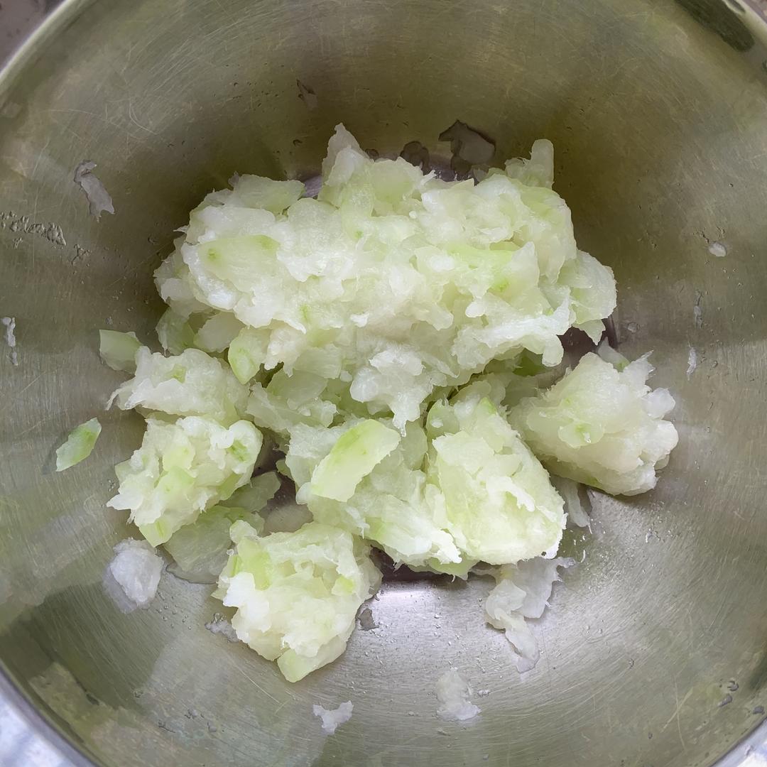 烧开水,把冬瓜入水煮8-10分钟直到透明,捞出用纱布挤干水分,此时剩余180g