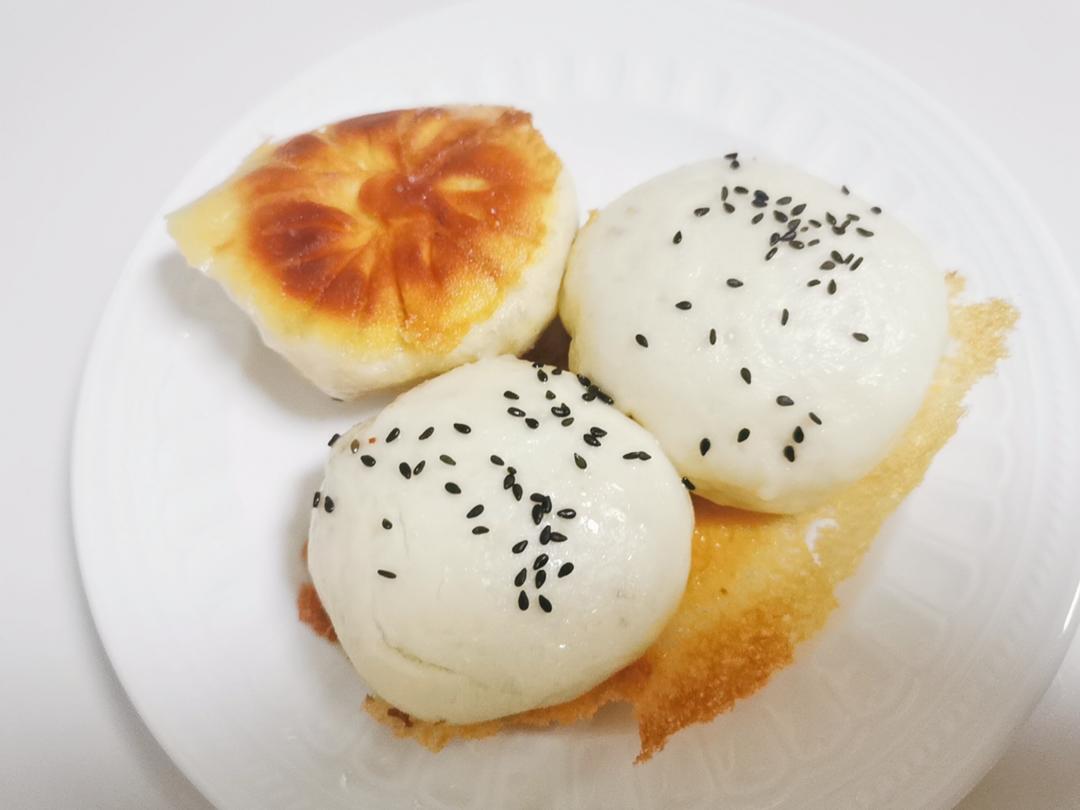 生煎煎到底部微微变黄,一碗水加一小把面粉,搅拌均匀,浇到生煎上,盖盖焖至汁水快变成锅巴,放入葱花(你们当做我放了)和芝麻