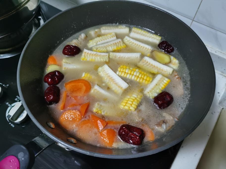 玉米,胡萝卜,枣,搁锅里,开大火煮开,小火咕嘟20分钟。 家里有冻豆腐,本来打算炒小白菜的,懒得做了,就一块加排骨汤里了,可见这道菜其实很随意,很简单。 出锅前,加盐,鸡精调味。自己试着加就行
