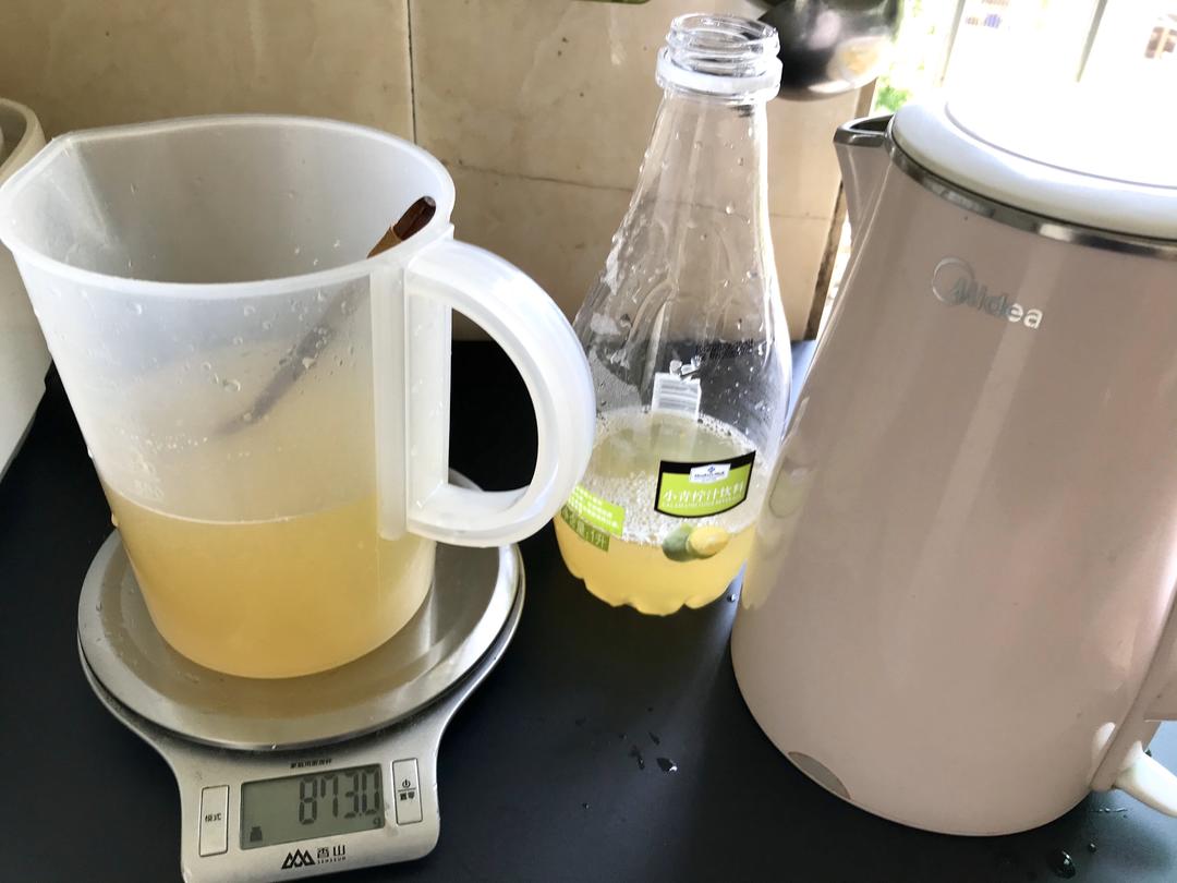 在柠檬汁中加入170g蜂蜜搅拌,再倒入700g凉白开再次搅拌,装瓶冷藏,完成!