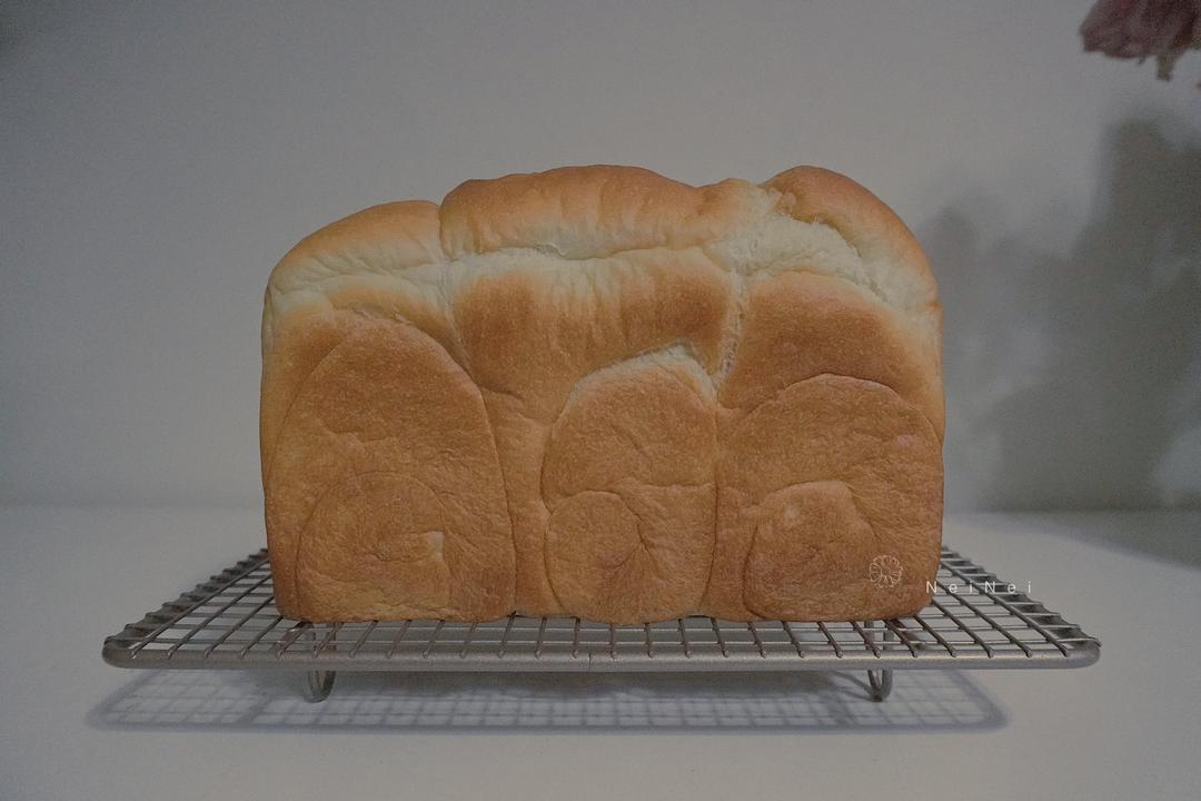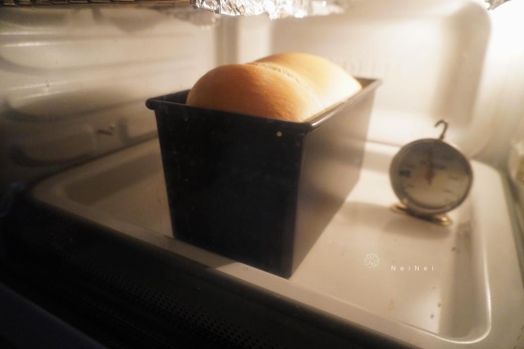 烘烤了20分钟左右,表面开始逐渐上色。 如果在烘烤结束前3-5分钟,观察到吐司表面颜色还很浅,那就拿掉烤盘,让其表面上色。 如果在烘烤结束前3-5分钟,观察到吐司表面颜色差不多已经是你想要的了,烤盘就可撤可不撤。因为上面加盖锡纸,最后的3-5分钟不会导致吐司表面上色过深。