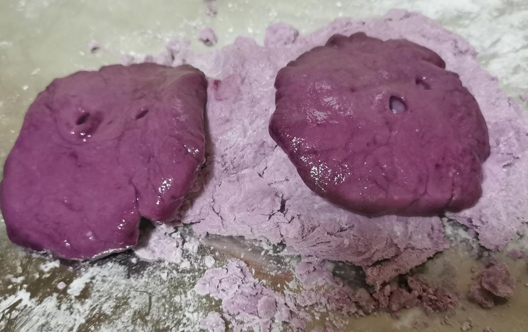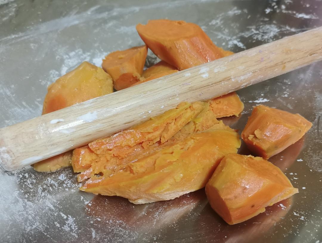 红薯蒸熟倒在案板上(我用不锈钢案板),趁热用擀面杖压成泥,红薯本身很甜,无需加糖也无需加水。