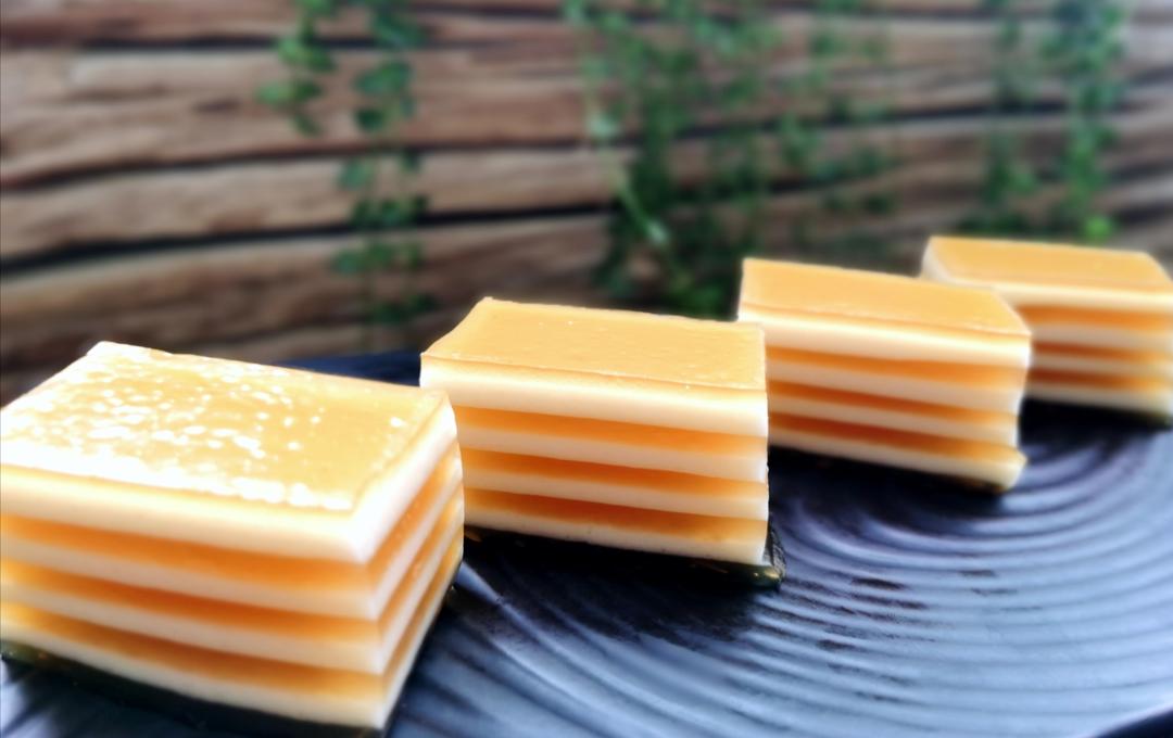 接着在蒸好的黄浆上浇上一层白浆,大约蒸六分钟左右取出再浇黄浆,此动作要重复好几次,直至黄浆白浆用完。切记白浆不可蒸过头,否则会水粉分离。