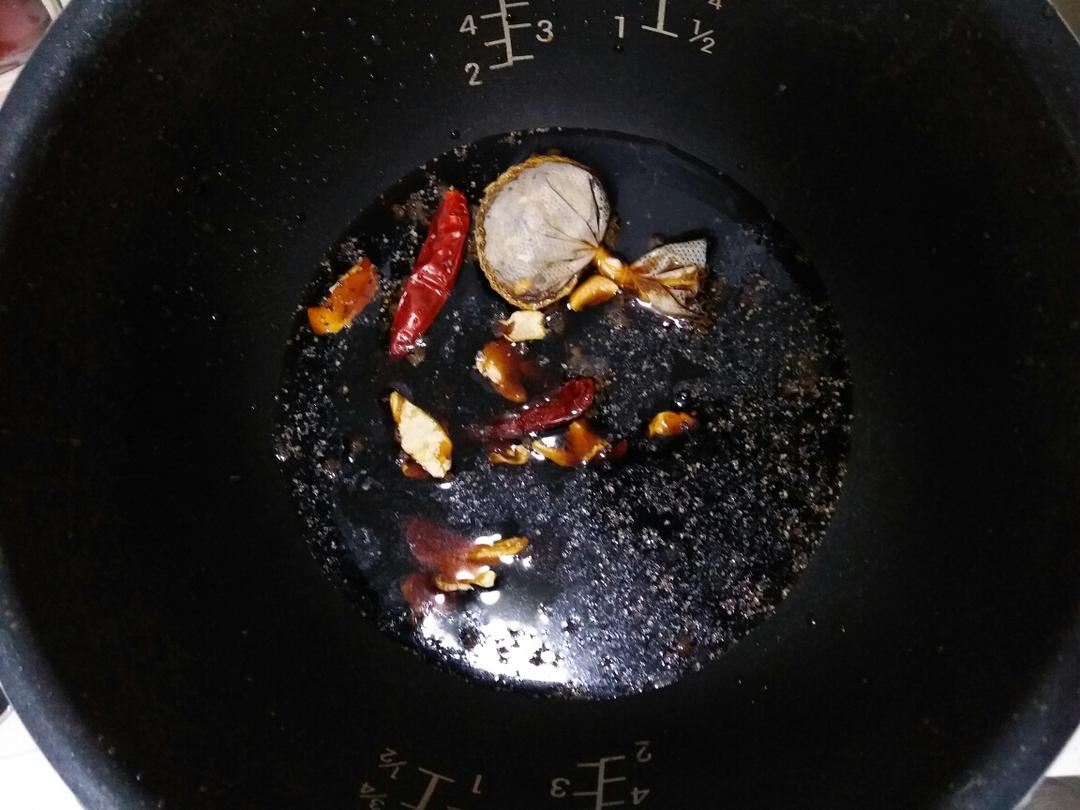 电饭煲中放入1小包炖肉调料、干辣椒、麻椒、1勺料酒