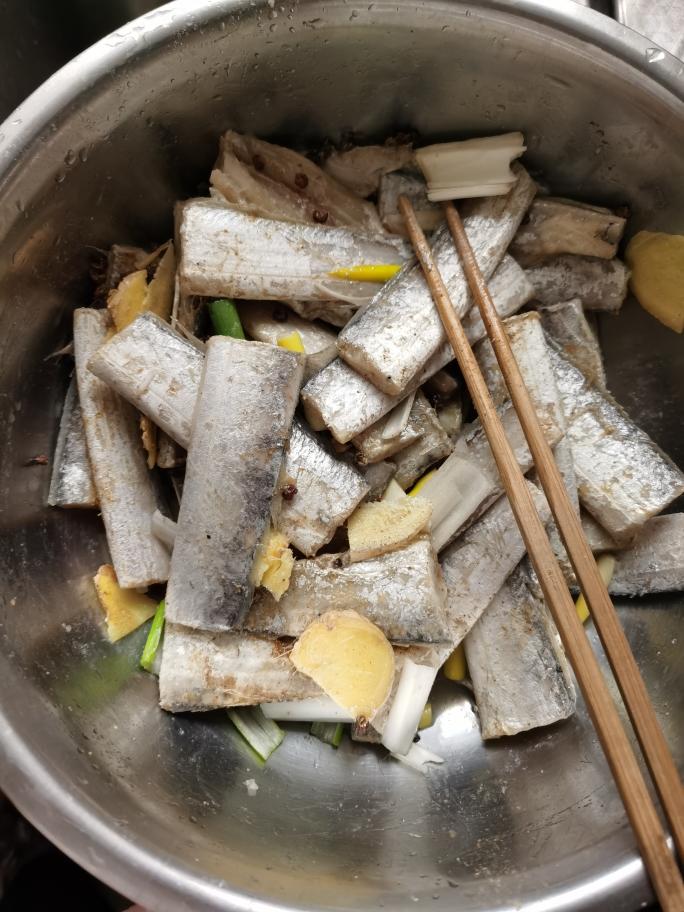 带鱼准备好,事先将其处理干净,去掉不能食用的部分,将带鱼剁成长短适中的段。
