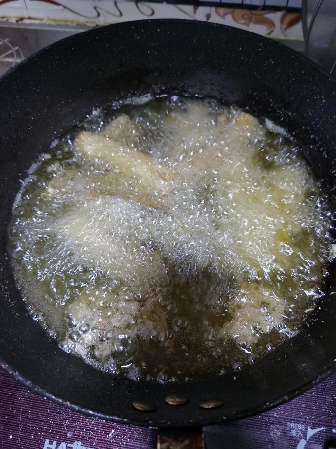轻轻抖动下,去掉多余的淀粉,锅中倒入食用油,待油温至7成热,将带鱼段放入锅中开始炸,不要来回翻动,小火慢慢炸至底部定型。翻面继续慢慢炸,直到将带鱼的另外一面也炸好便可捞出来,