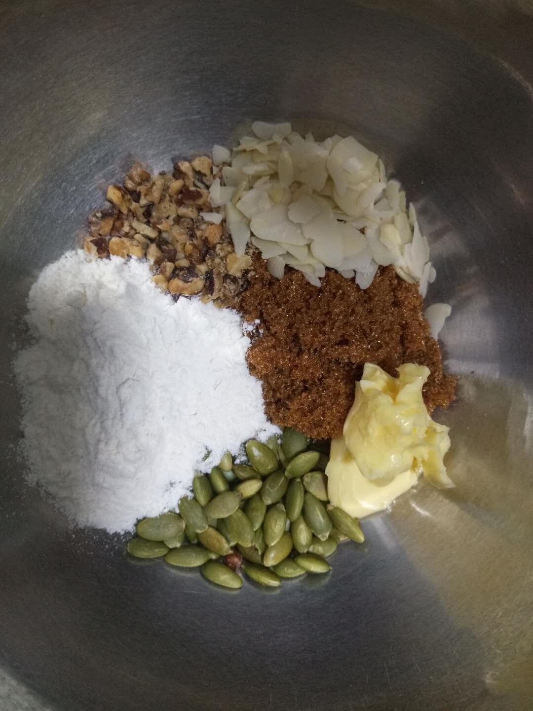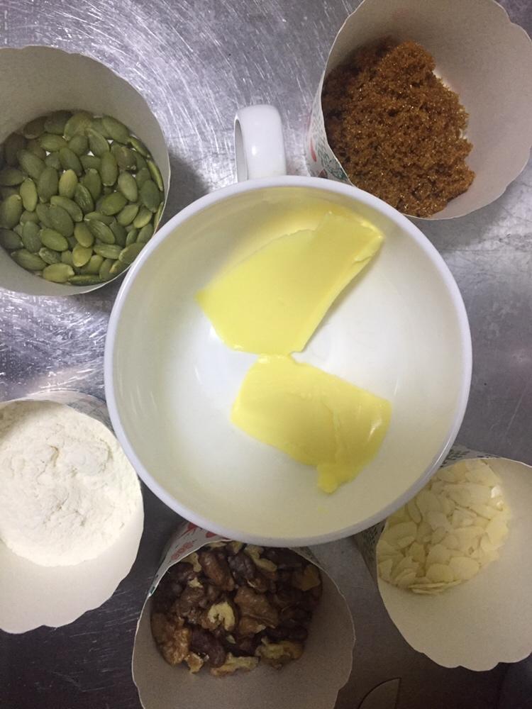 准备好酥皮原材料,15克黄油软化,核桃烤熟,南瓜籽炒熟,杏仁片直接使用。