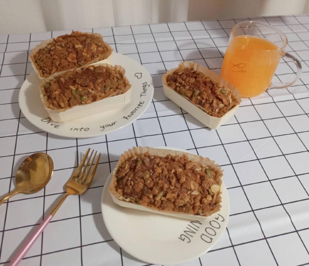1没有料理机,香蕉可以用勺子按压碾碎 2干果可以自由替换 3烘烤上色过重,可以加盖锡纸 4香蕉一定要用熟透的。
