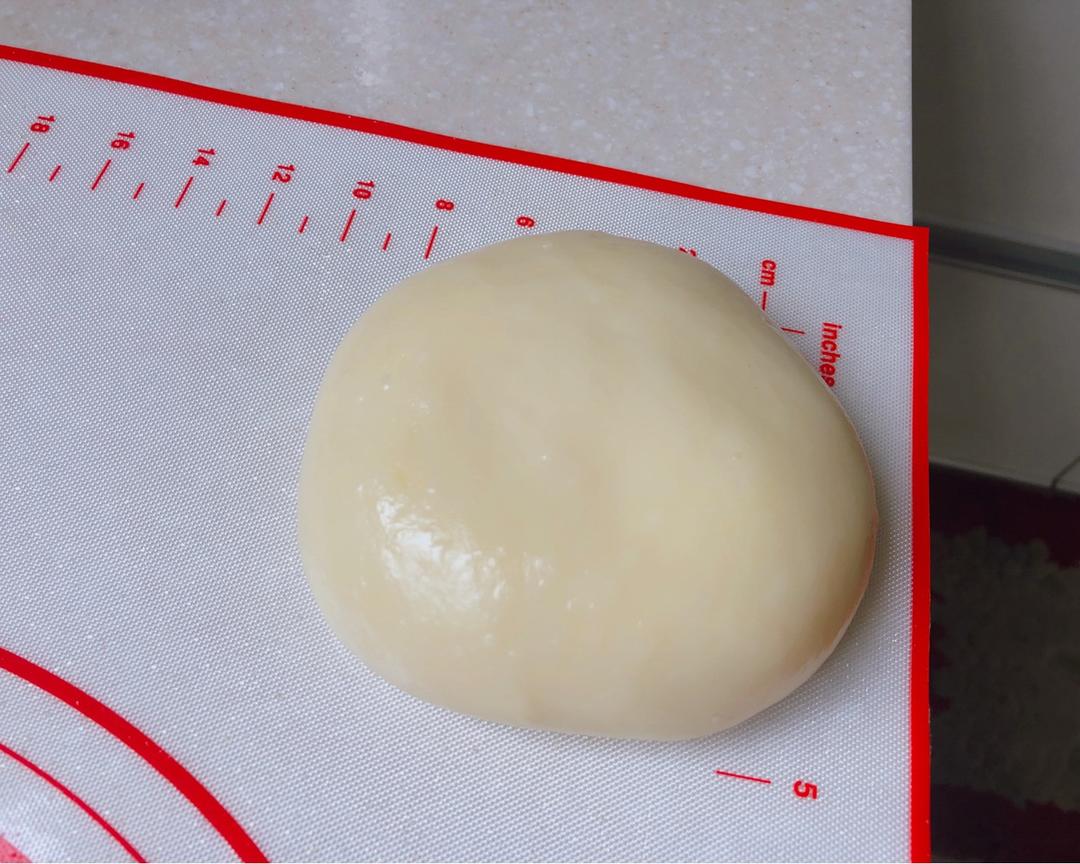 稍微放凉把黄油揉入面团中,面团最后是光滑滴,盖好放着备用(这步我用面包机揉了,能懒则懒,而且不烫手)