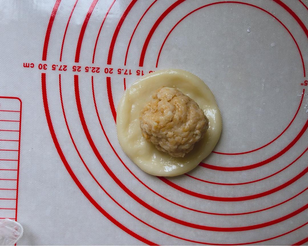 滚圆的面团用用手压平中间放入燕麦馅