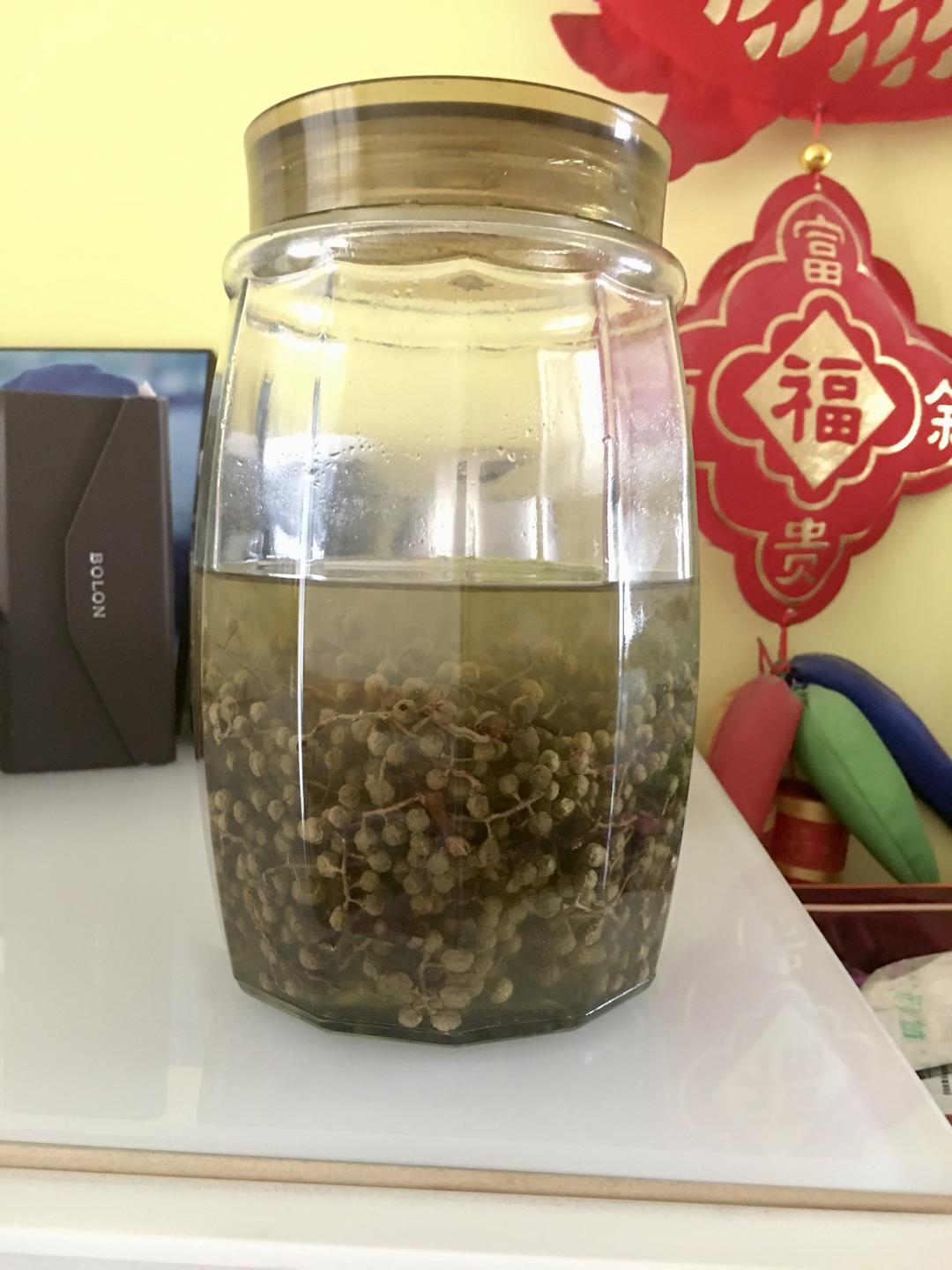 浸泡一天后,花椒是青绿色,油是清亮的没有任何变化。
