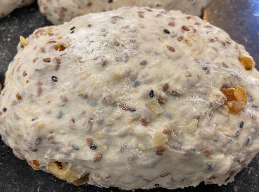 坚果和面团揉均匀之后,撒少许粉放桌面松弛醒发30分钟,覆盖保鲜膜
