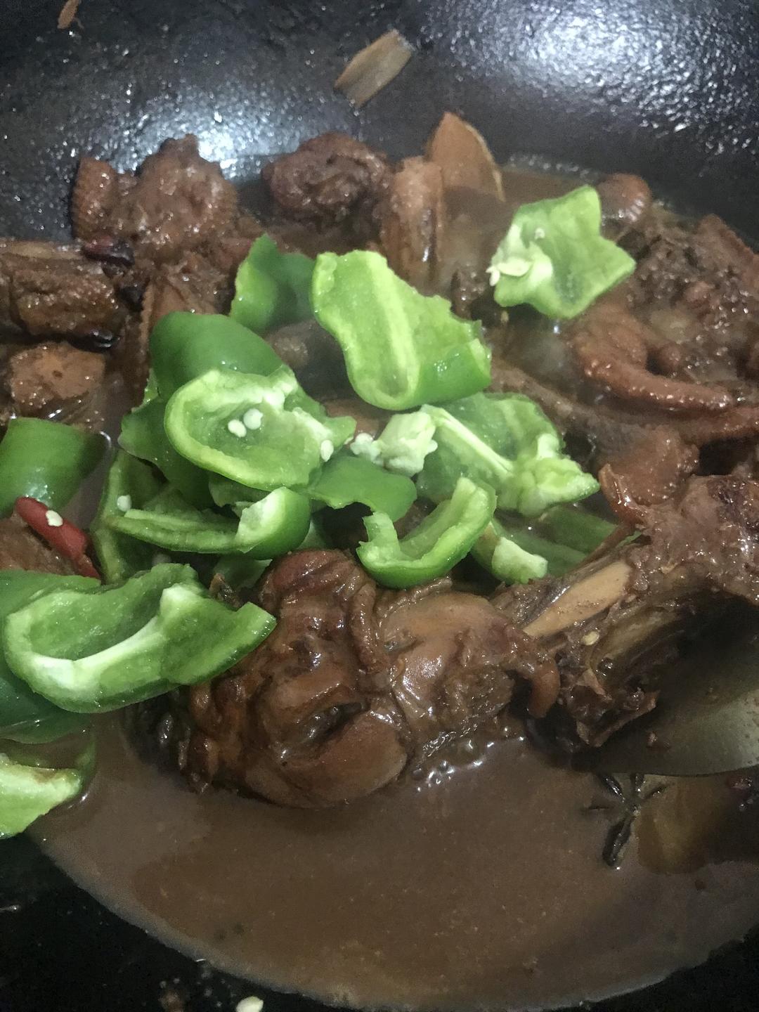 汤汁剩下三分之一的时候放入青辣椒和小米辣、稍微收下汁就可以出锅了