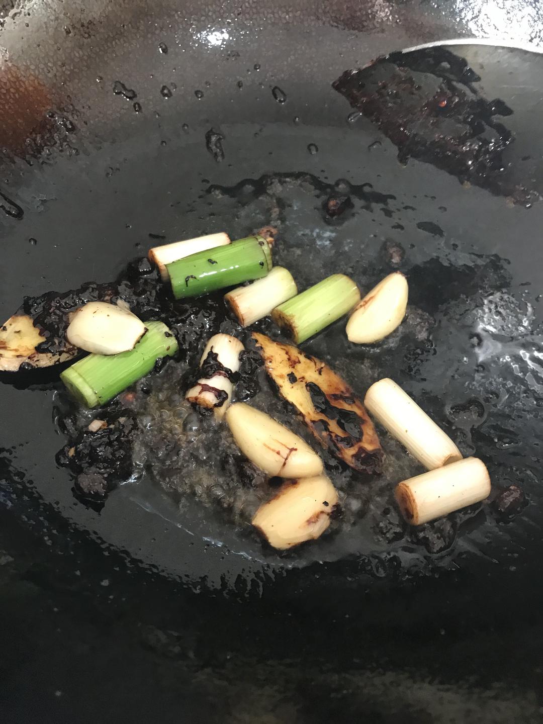 炒化放入豆瓣酱、葱姜蒜炒香