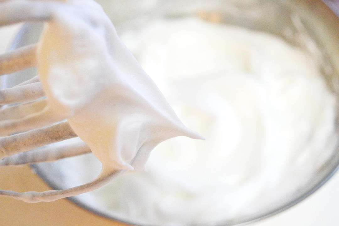 四个蛋白分三次加入细砂糖打发至提起打蛋器出现直立的尖。