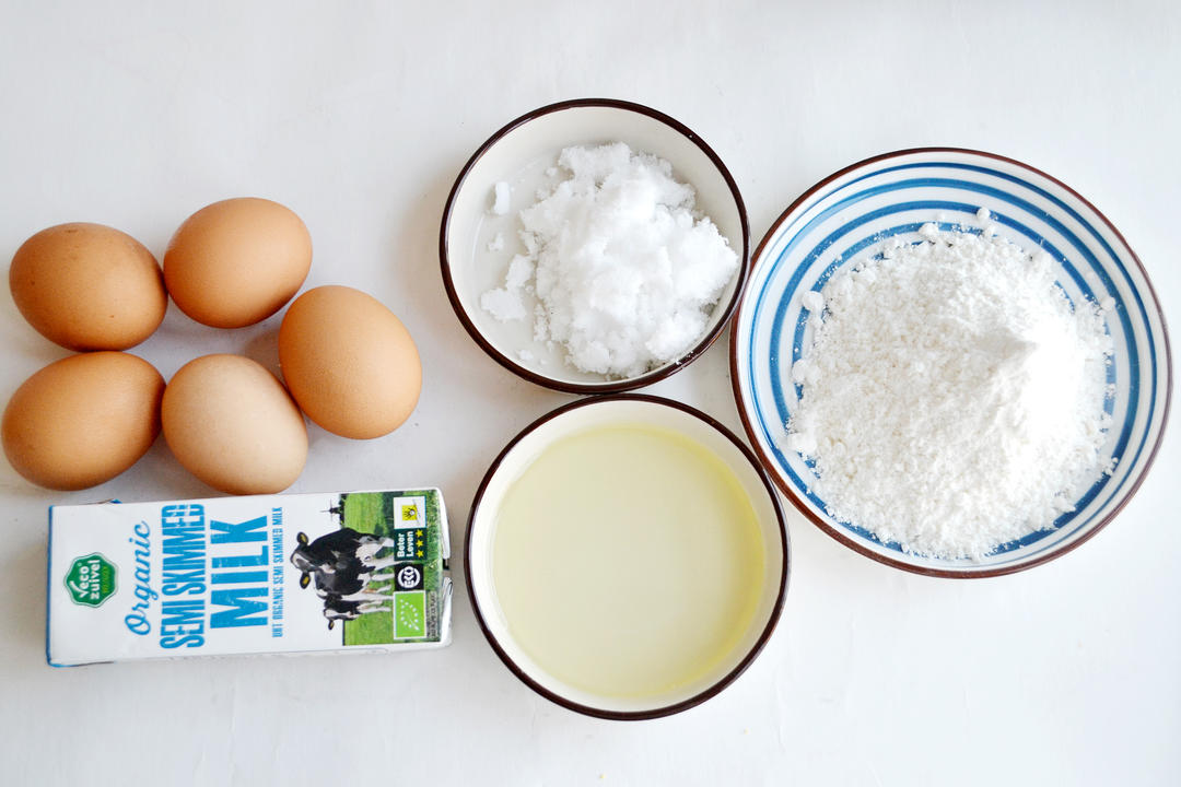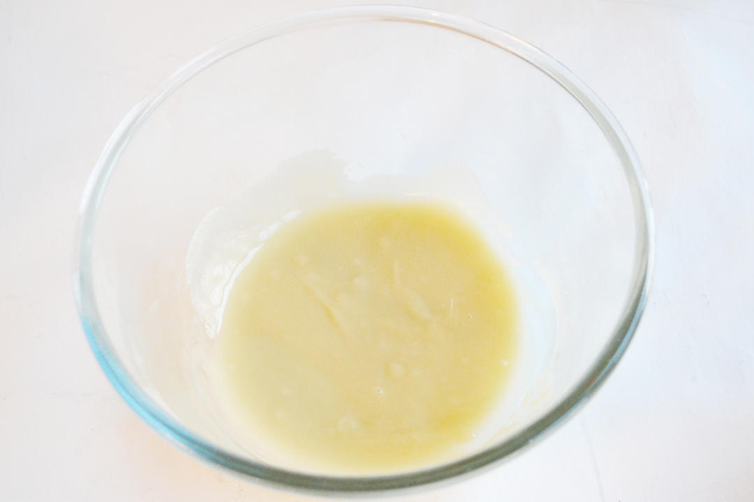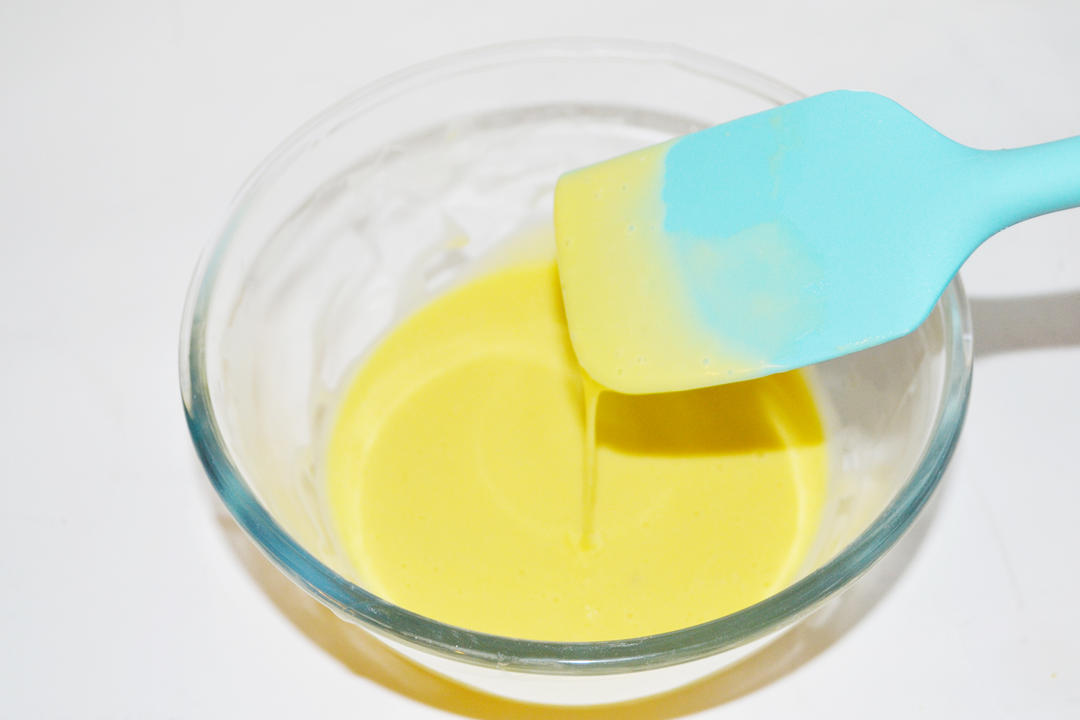 玉米油倒入锅中加热至80度,倒入低筋面粉中,边倒边搅拌均匀。