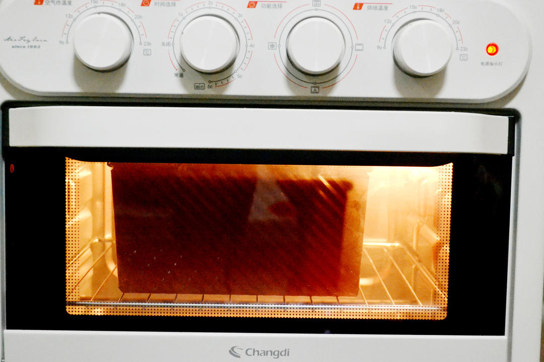 长帝空气炸烤箱预热,140度烘烤70分钟即可(采用水浴法,土司盒下面放一盘热水)。