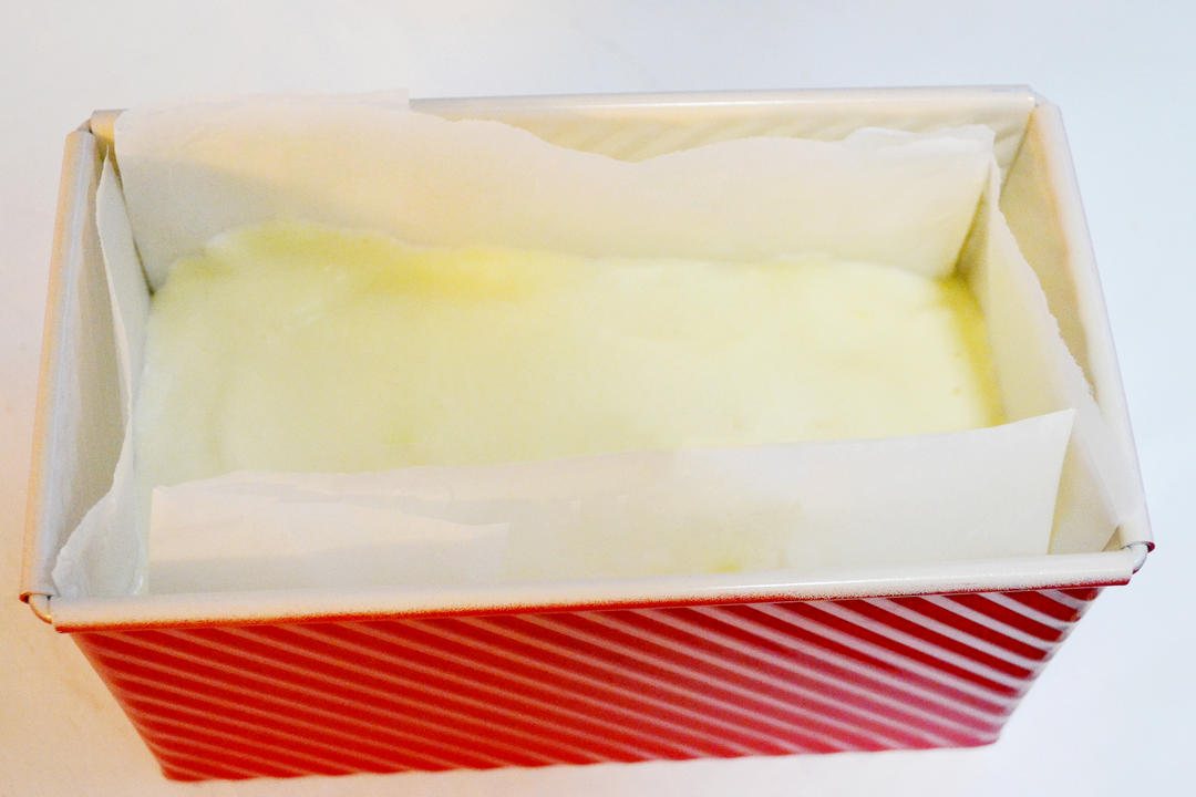 取1/3蛋白糊倒入蛋黄糊中,用切拌的手法拌匀。然后再将蛋黄糊全部倒入蛋白糊中,翻拌均匀,倒入铺好油纸的吐司盒中,轻震几下震出大气泡。