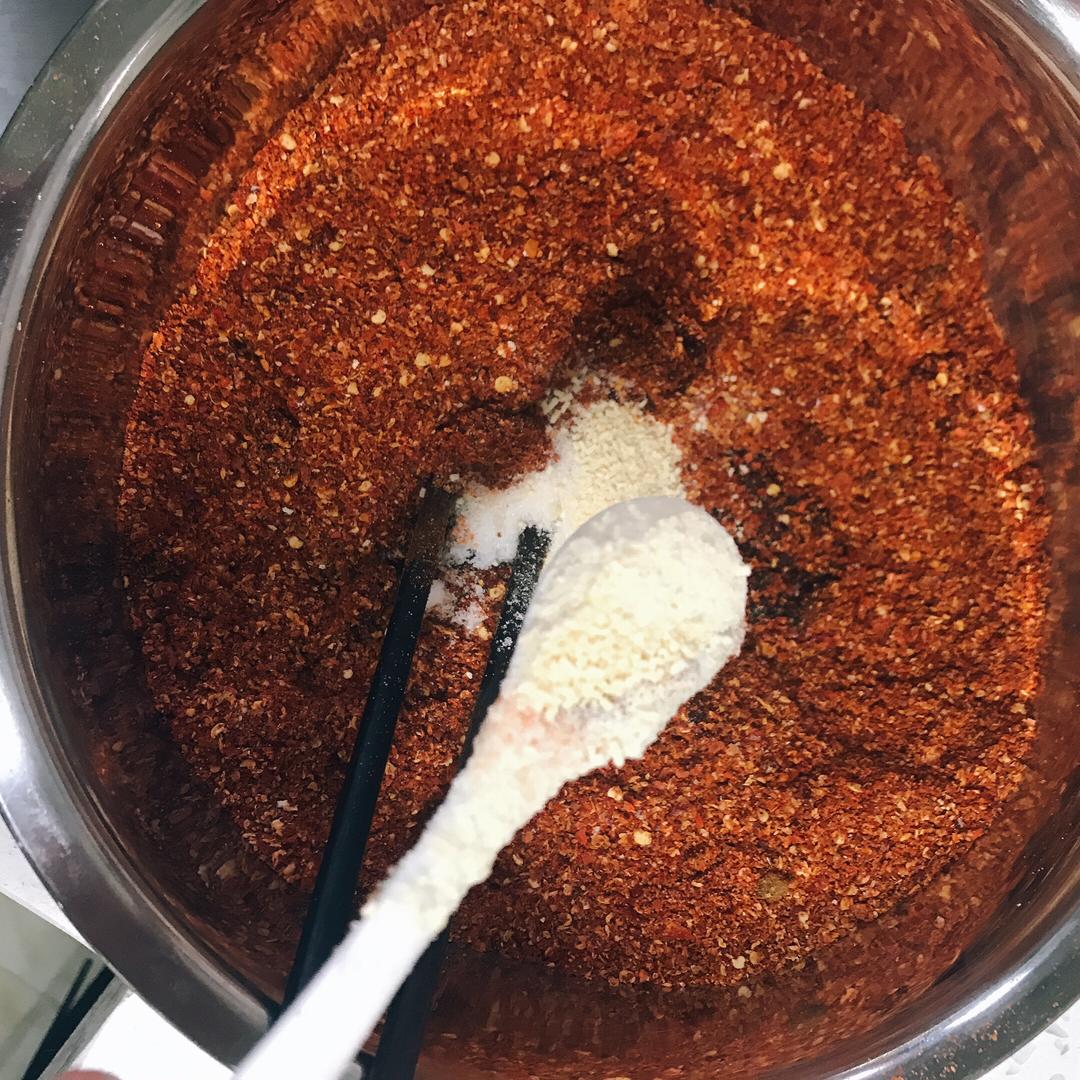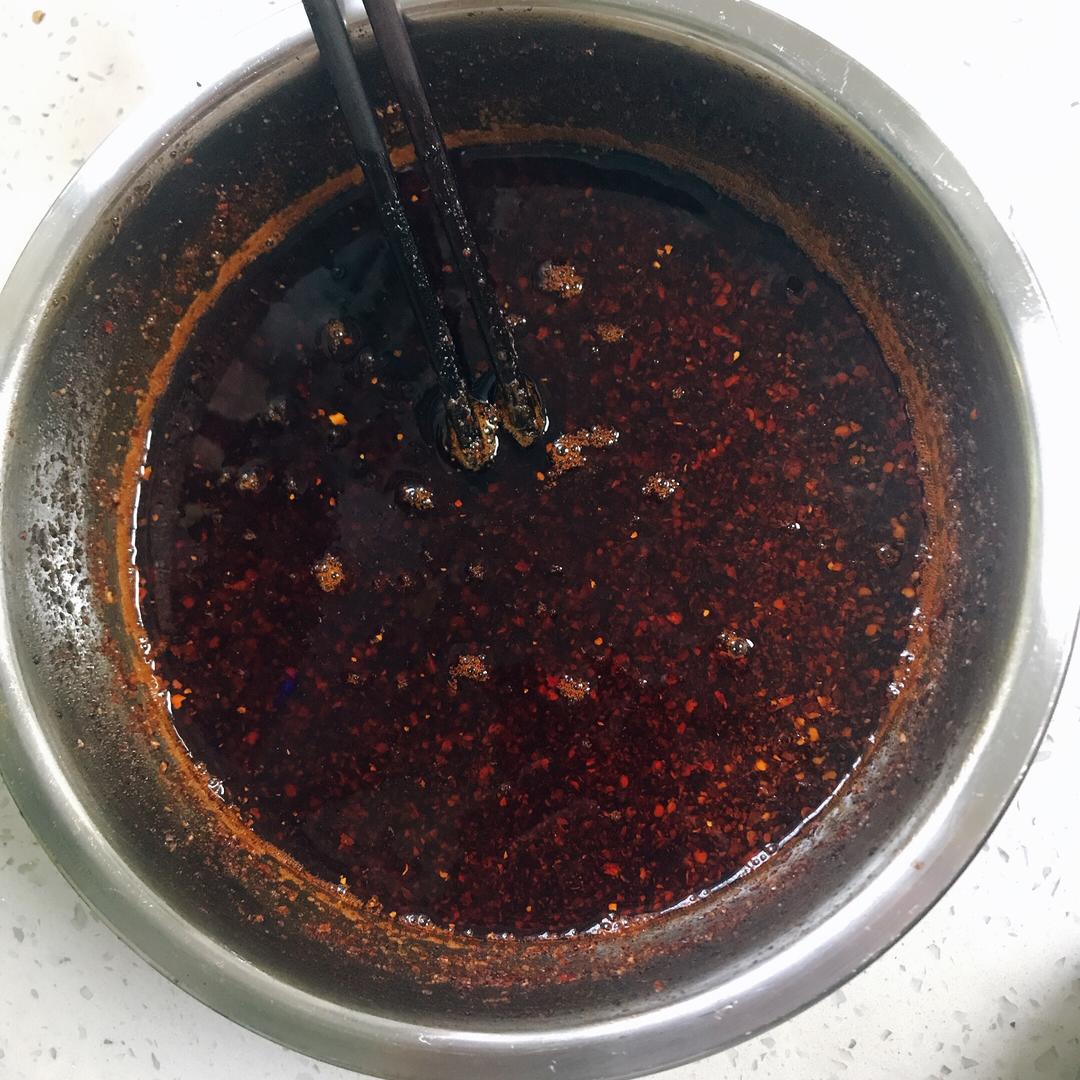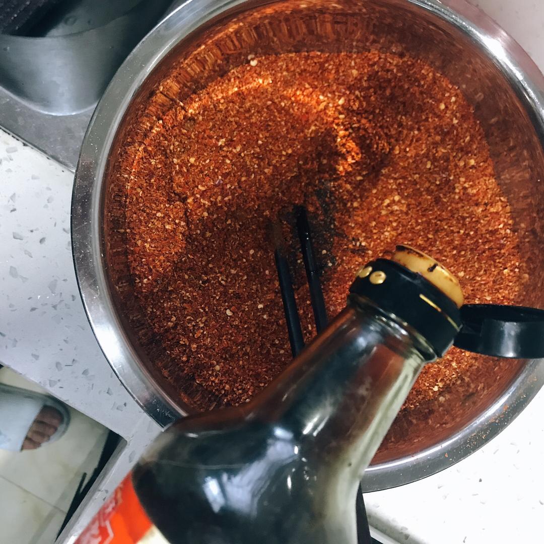 依次少量的把油倒进辣椒粉末中