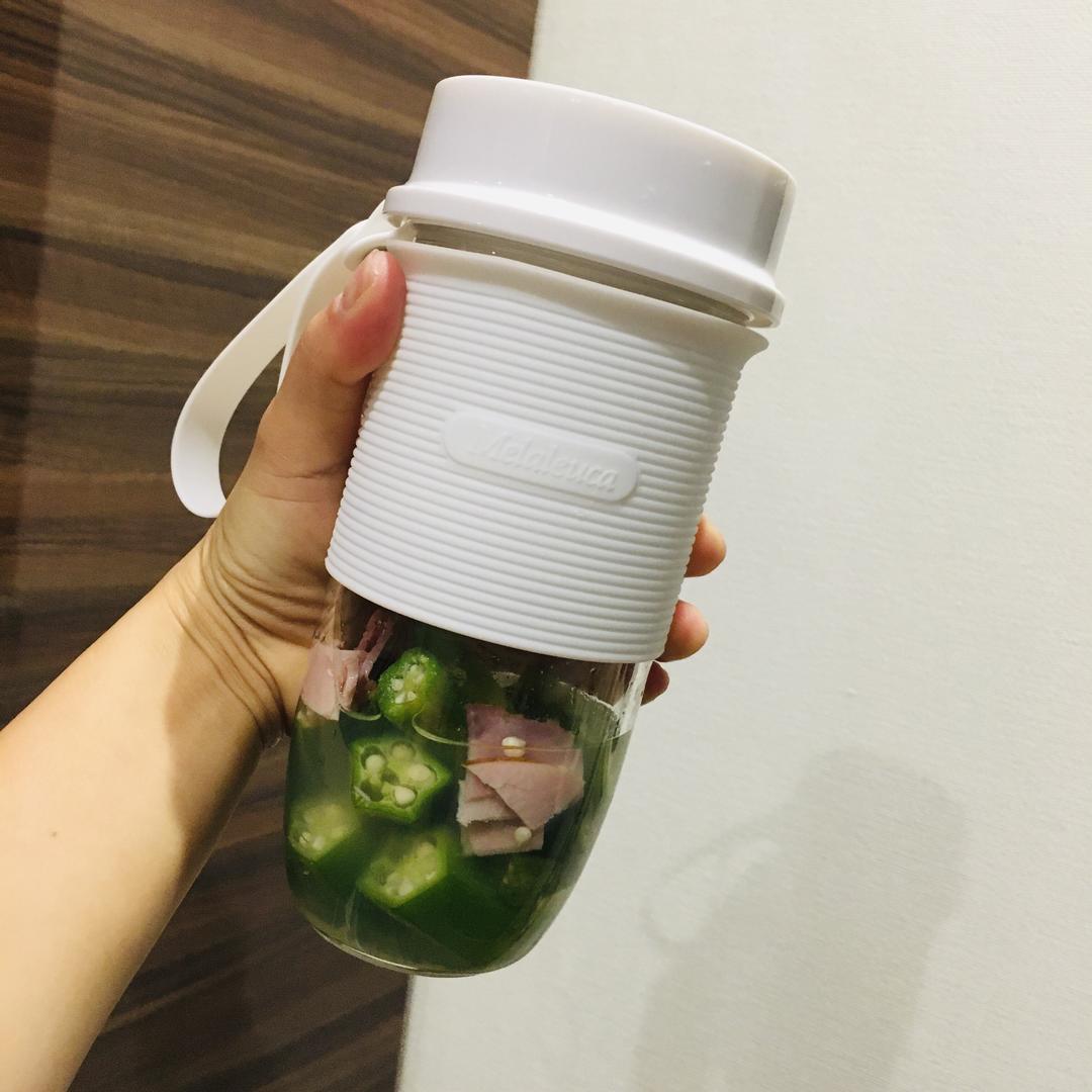 前面部分忘记拍图。直接文字叙述。 1.秋葵4-5根(3人量),洗净。 2.水烧沸,秋葵放沸水中煮3-5分钟。(适当煮一下就好) 3.秋葵捞出来沥水,待不烫手后去除根部,切断,放入榨汁机中。 4.培根小火煎一下,略带油煎香即可(或者加热了即可,个人觉得煎老一点更有味) 5.培根切半,切块,一半丢进榨汁机中,另外一半备用。 6.生姜薄薄一小片,切丝,丢进榨汁机(不喜欢生姜可不用) 7.加适量盐、鸡精、凉开水进榨汁杯