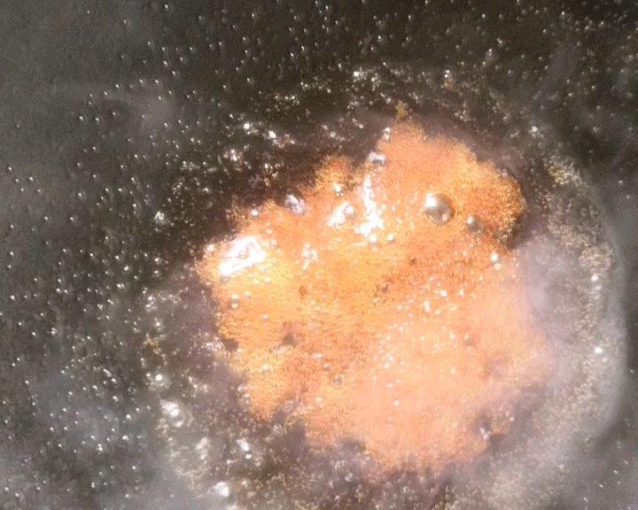 锅中油热,放入酱汁,小火,注意必须小火,炒焦就不好吃了,翻炒一下