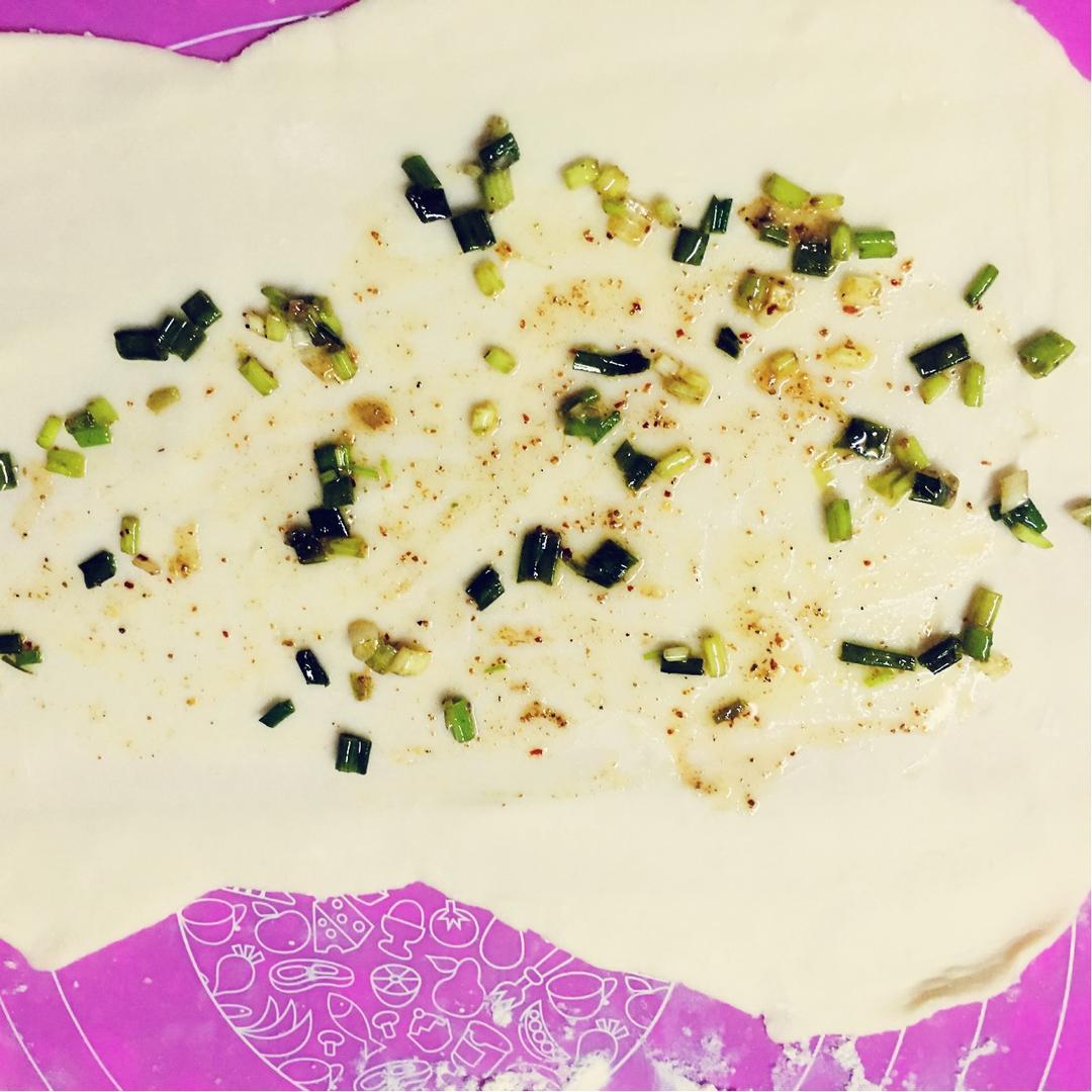 面粉醒30分钟后,揉成长条,分成5个小面团,一个50克左右,将小面团擀成薄薄的,抹上葱花