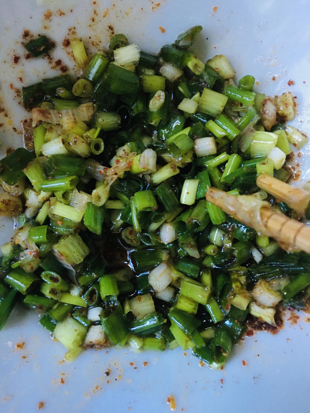 锅里油烧热,淋到葱花上,激发葱花释放葱味,搅拌均匀