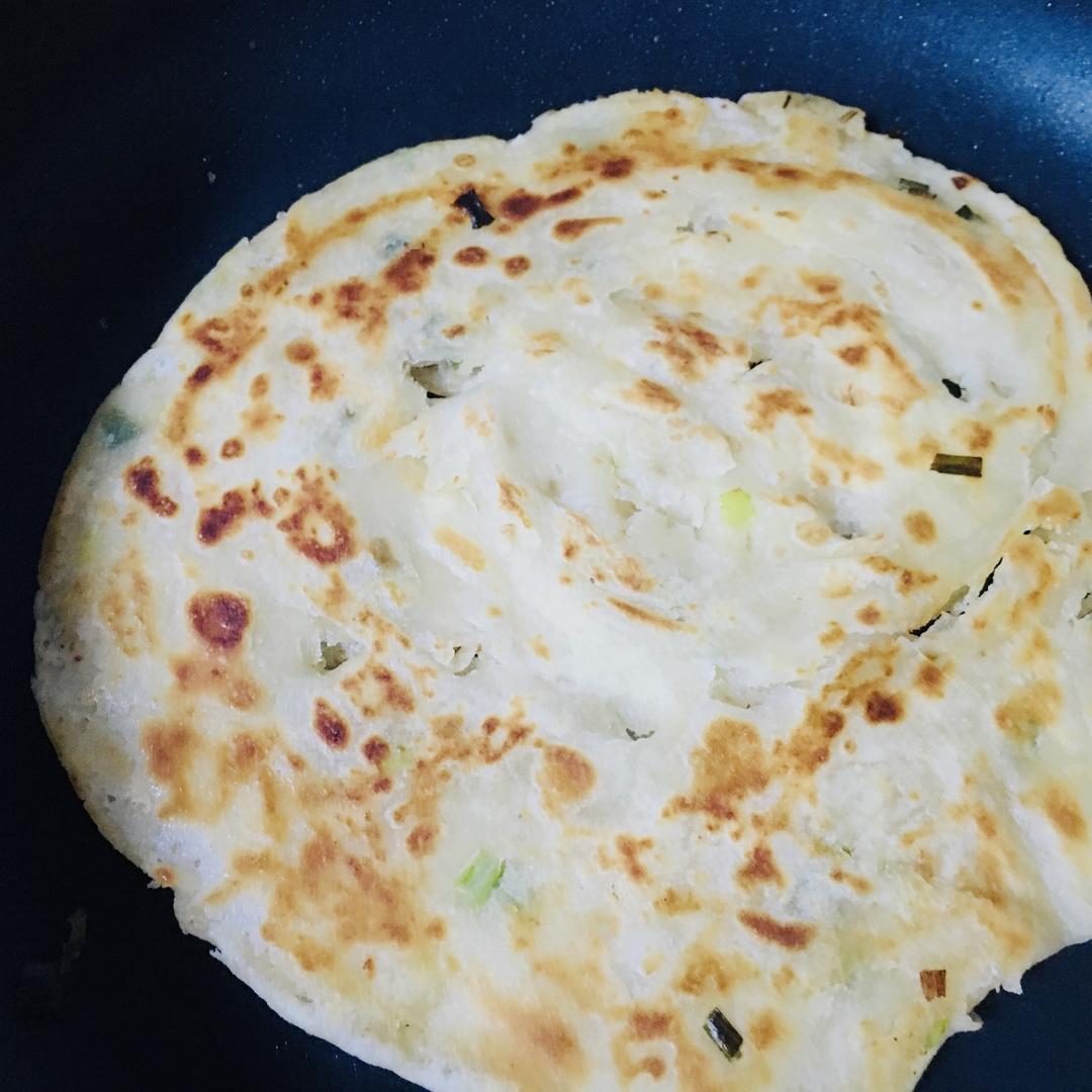 锅底倒油,将饼放入锅中,中火煎,每隔30秒翻面,重复三到四次,三分钟左右出锅