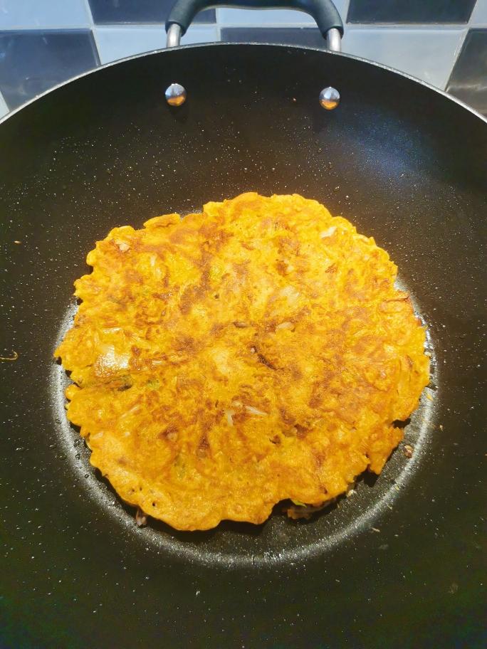不要用大火!不要着急翻面!要有耐心!不然就会失去饼。。并收获一坨坨泡菜堆儿。。。 等到饼一面煎到微焦,翻面