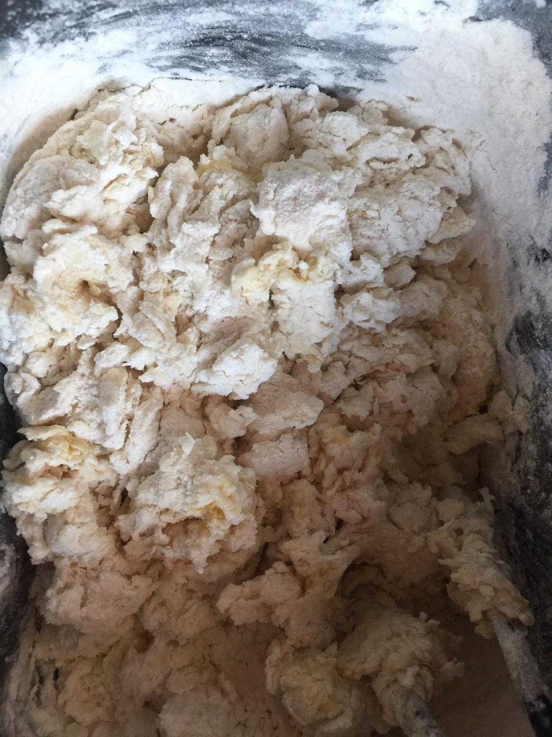 再放高筋粉,中间挖个眼放酵母,在侧边放盐。盐和酵母不能放在一起。然后低速搅拌均匀,再换高速搅拌。