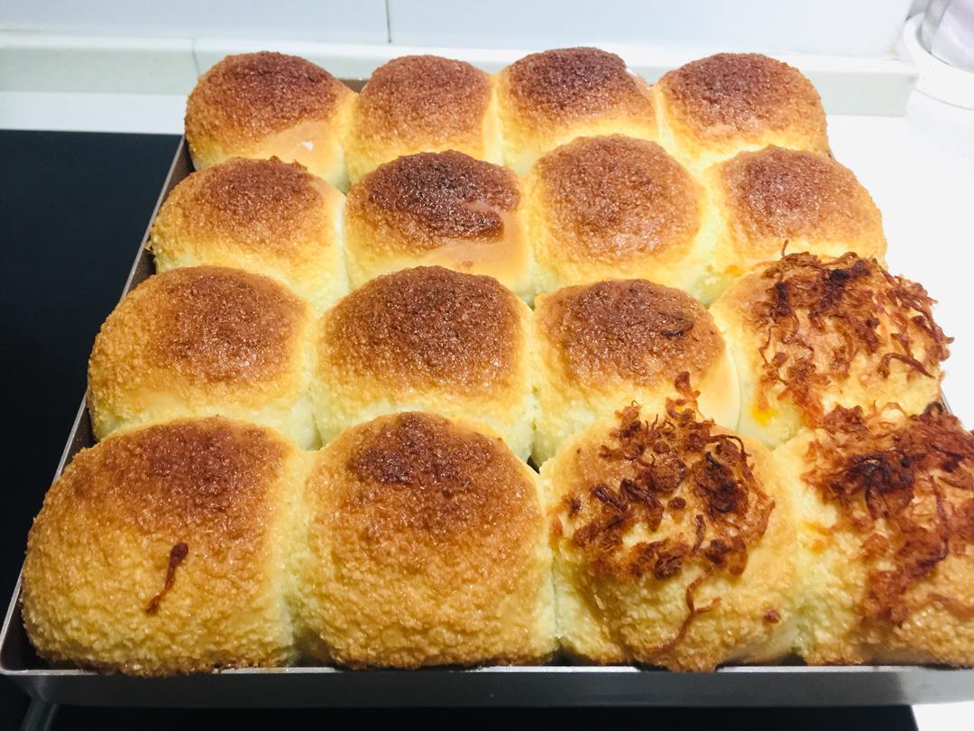 这是烘烤中,我想尝试下放肉松是什么样的,没想到话糊,所以大家就不要做参考了。 我的烤箱是ACA火力挺大的,每个人的烤箱不同,所以烤的时间和火力也不同,我的时间只能参考 上下火180 10分钟然后把上过调整为150度 下火还是180继续10分钟