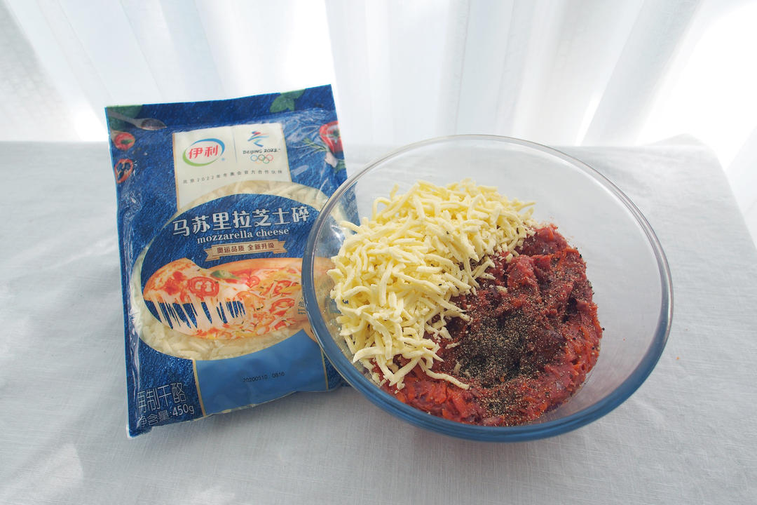 将30克蚝油+1.5克五香粉+5克糖+3克盐+30克橄榄油+15克一品鲜酱油+2克黑胡椒碎+伊利马苏里拉加入牛肉馅中。