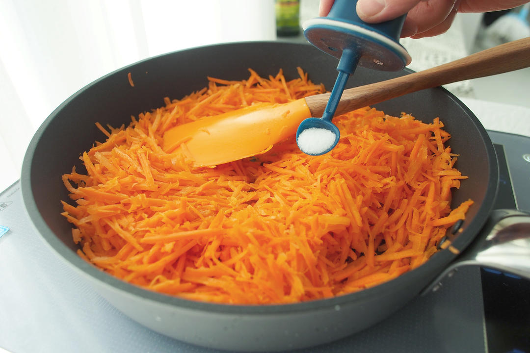 锅里加少量橄榄油(约20克),待油稍热放入胡萝卜,加一小勺盐,小火翻炒至断生,胡萝卜稍稍变软即可离火,晾凉待用。