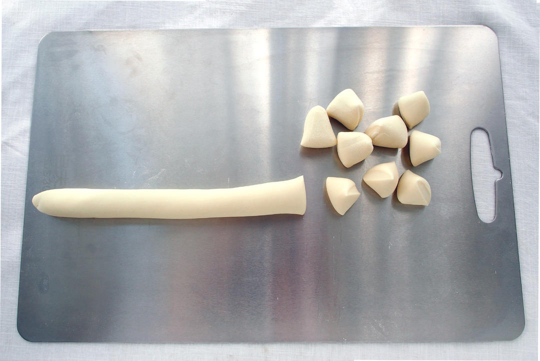 切一条面团滚成长条,滚刀切成小剂子。