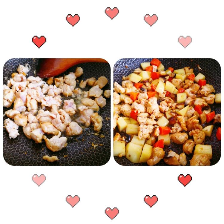1.鸡肉用刀背敲敲然后用淀粉抓一抓,会变嫩。 2.我的食材切成小块是为了熟的快。有闲时间可以切大块,大块吃起来更过瘾啊😜