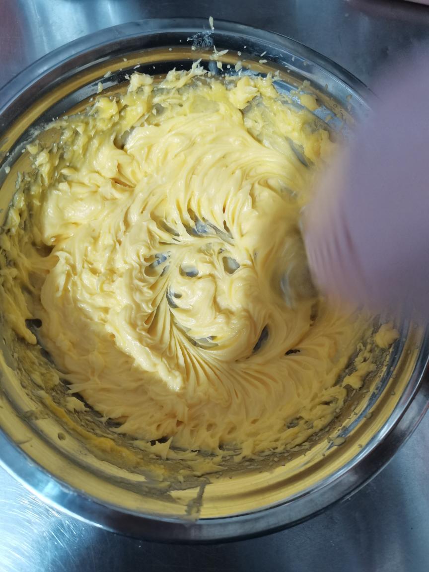第3、加入过筛的蛋黄碎打蛋机搅拌均匀(蛋黄一定要细网筛过筛)
