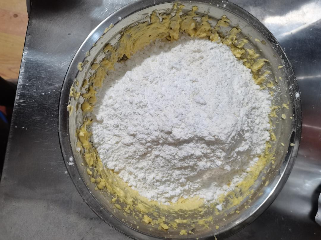 第1、 准备好所有材料 巧克力豆和可可粉忘记拍照了 玉米淀粉和面粉混合放一个盆里 蒸熟的蛋黄需要过筛一下 盐放糖粉里面了😊