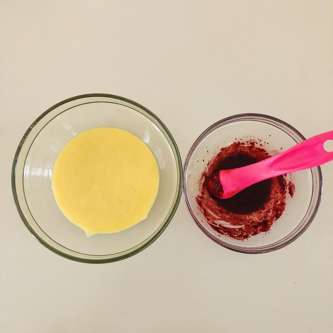 1克红曲粉用2克温水化开,倒入其中一份蛋黄糊中。