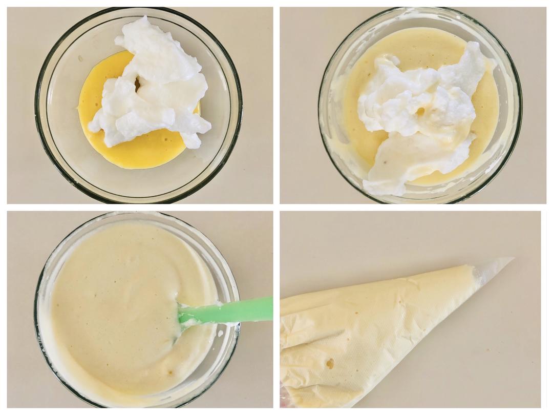取15克蛋白霜,放入原色蛋黄糊中,用刮刀翻拌均匀。 再加入30克蛋白霜,翻拌均匀。 拌好的蛋糕糊装入裱花袋。