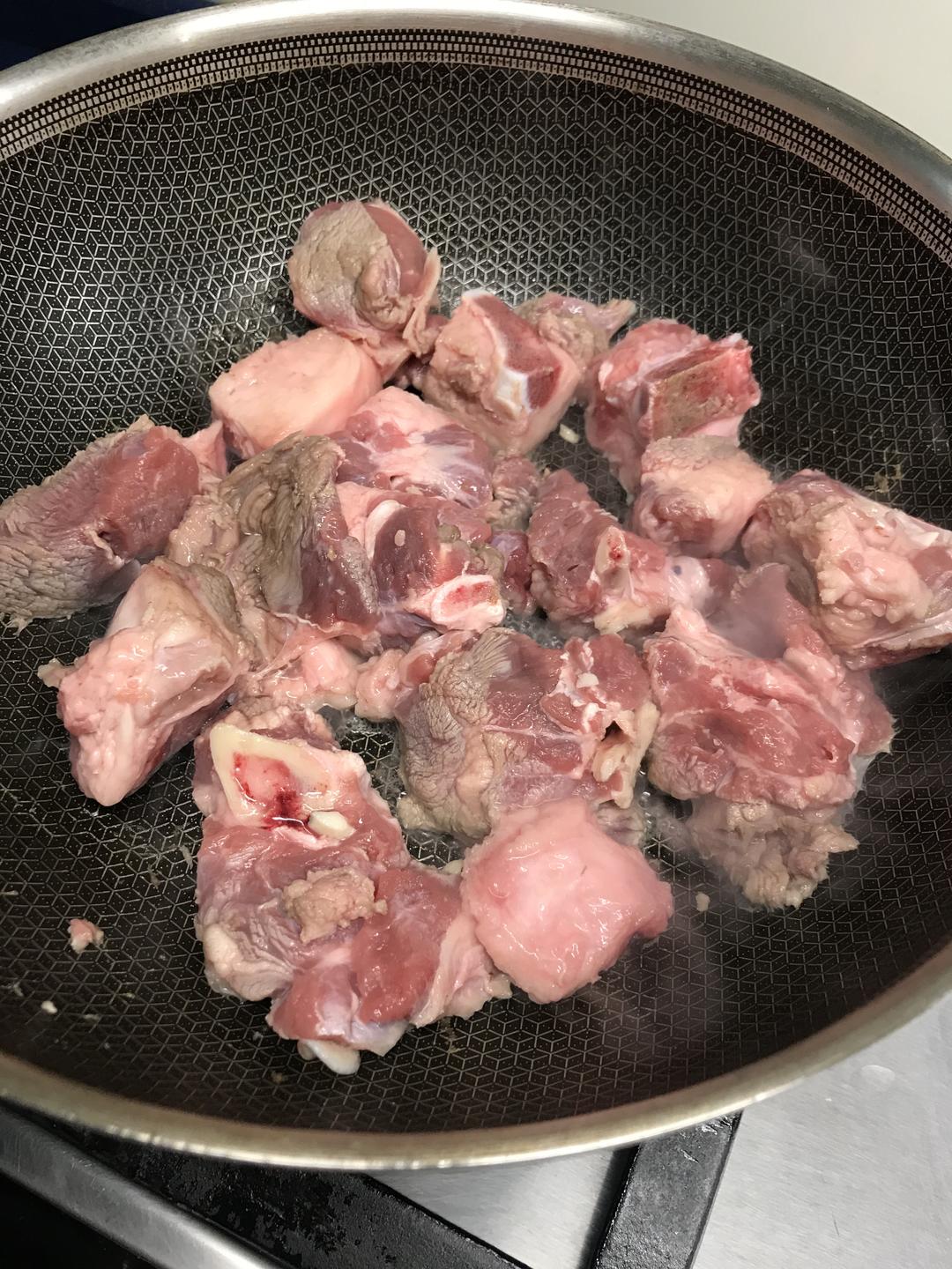 第一步炒羊肉,不要放油,把羊肉丢进锅里炒干水分,炒出油脂。