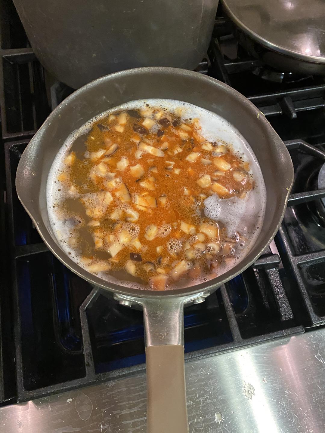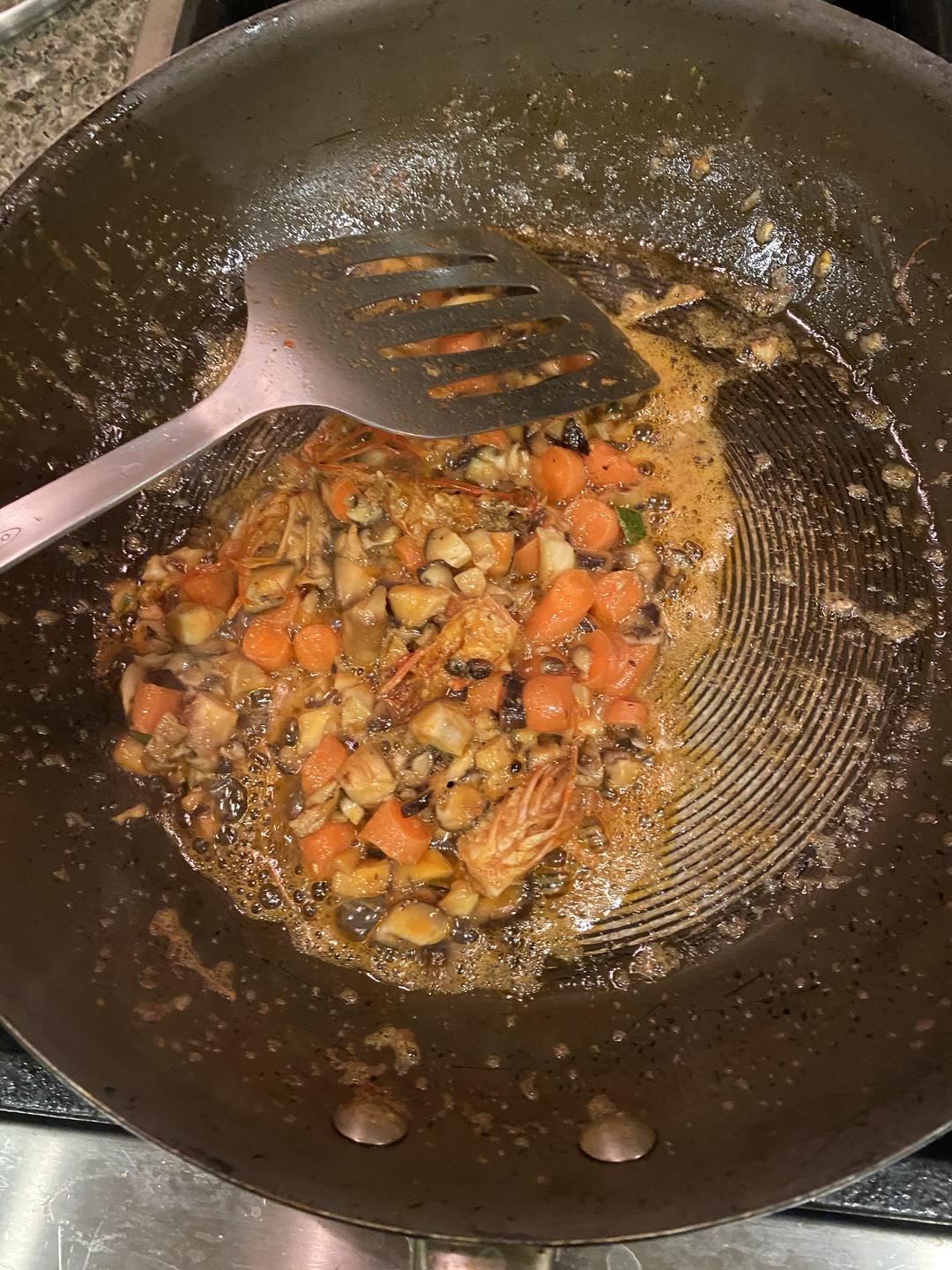 倒油,煸炒虾头,加入葱叶小火,然后加入胡萝卜和香菇煸炒