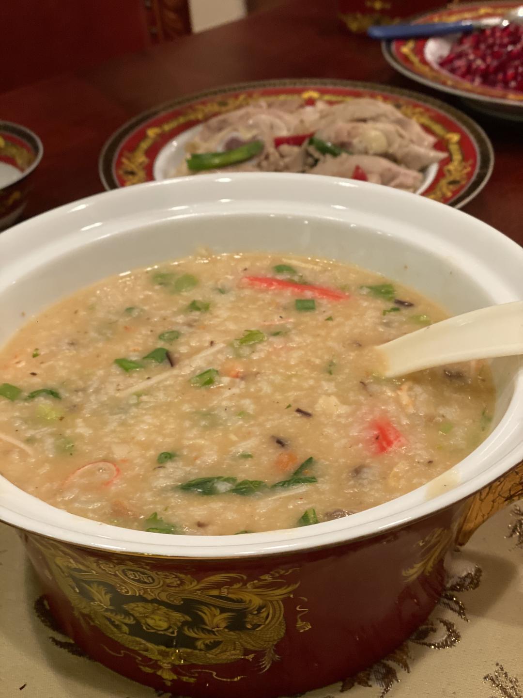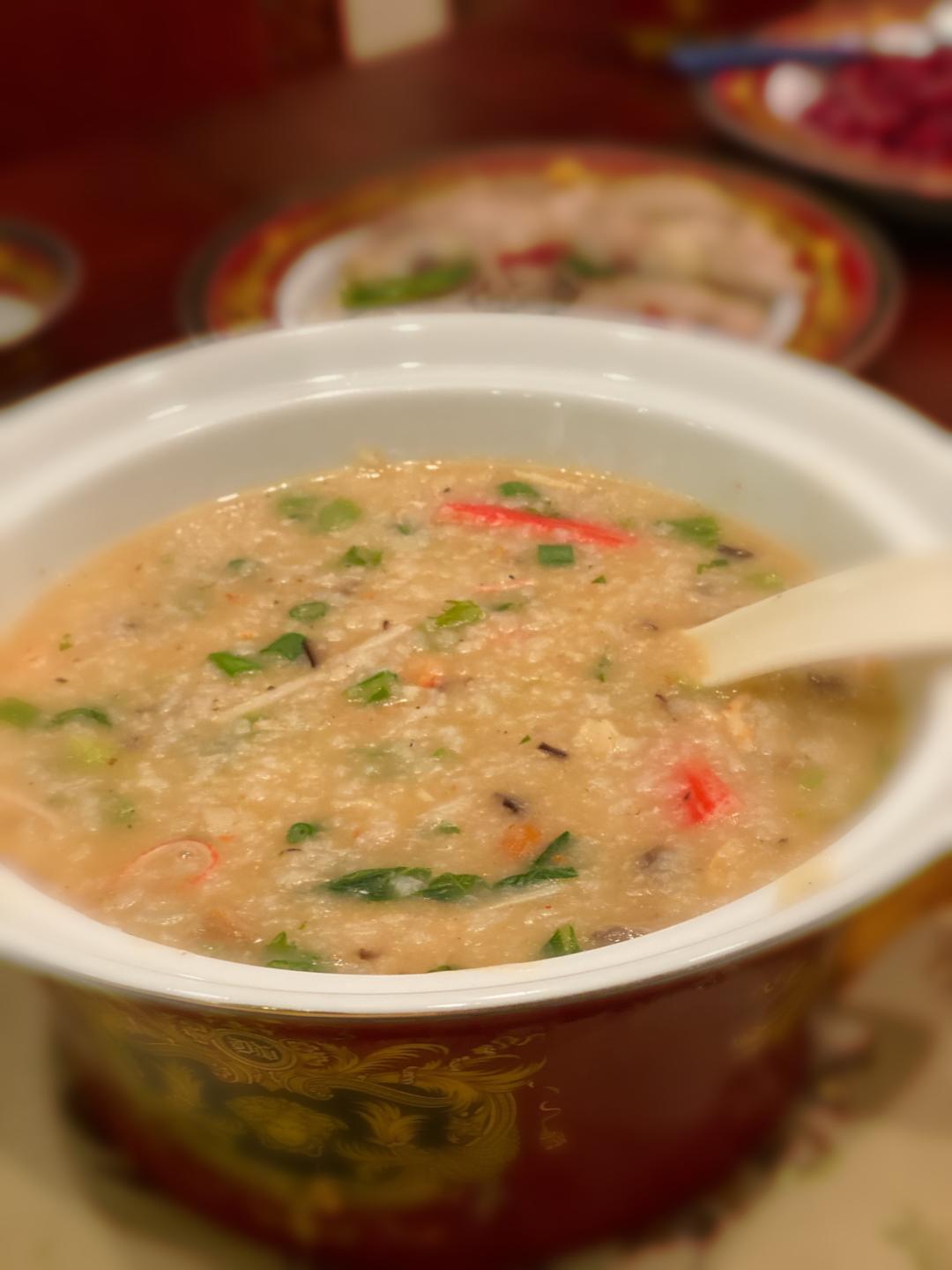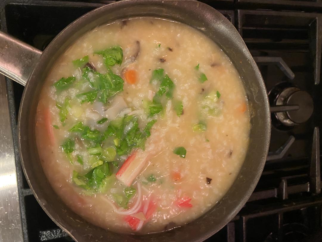 倒入虾仁、蟹肉、带子、青菜、豌豆、姜末、盐和白胡椒粉,煮十几分钟