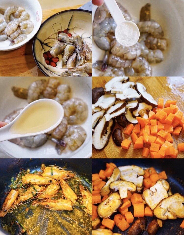 虾去头,虾剥皮去黑线,加上带子用料酒和盐腌制,香菇和胡萝卜切丁