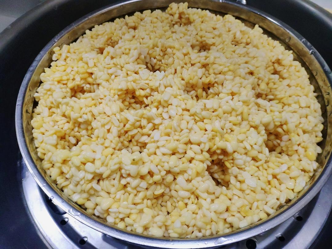 1,去皮绿豆倒盆里加水放冰箱泡一夜。 2,准备蒸屉,漏洞略大可以用油纸垫底,把泡好的绿豆捞出放蒸屉,撮几个孔,隔水蒸半小时
