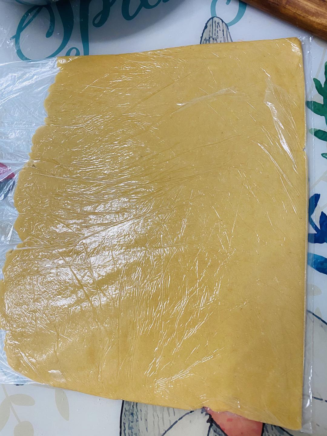 分成两份,分别放在两个保鲜袋里擀平,放入冰箱冷冻10分钟。 厚度3-4mm适中,烤好后会变厚一些。 如果喜欢更脆可以薄一些,注意缩短烘烤时间,以免烤糊。